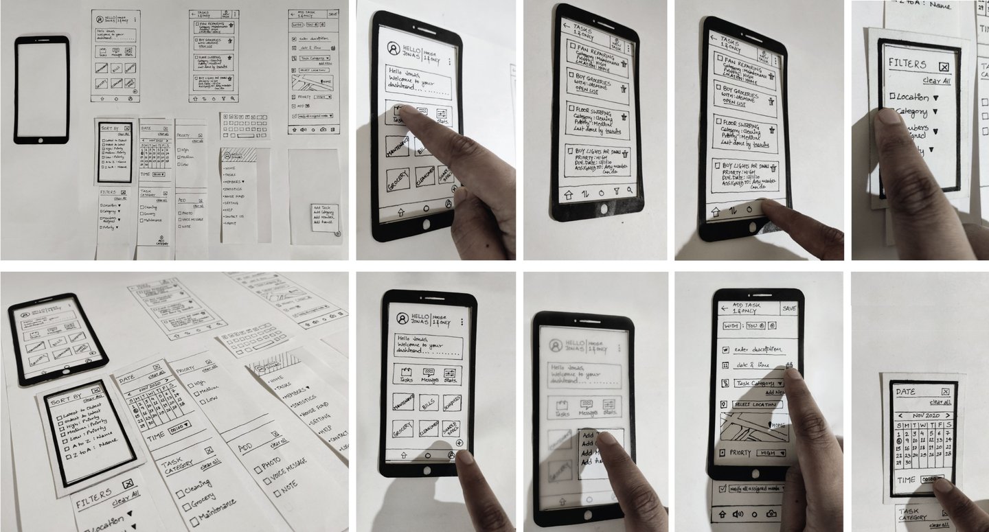 The paper prototype shown below was created and to explore & test key flows like account creation, adding tasks, and filtering/sorting the task list for a home management app. By testing at this low-fidelity stage, I was able to uncover usability issues and quickly reimagine interactions.